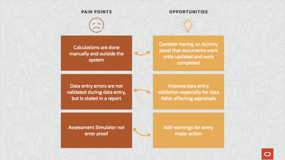 Initial research revealed that productivity pressures heavily shaped user behavior. Assessors and supervisors were motivated by speed and output but were slowed by manual processes, fragmented systems, and UI clutter. Many users had adapted to inefficiencies rather than expecting the system to support them, masking deeper usability issues. Some insights collected: